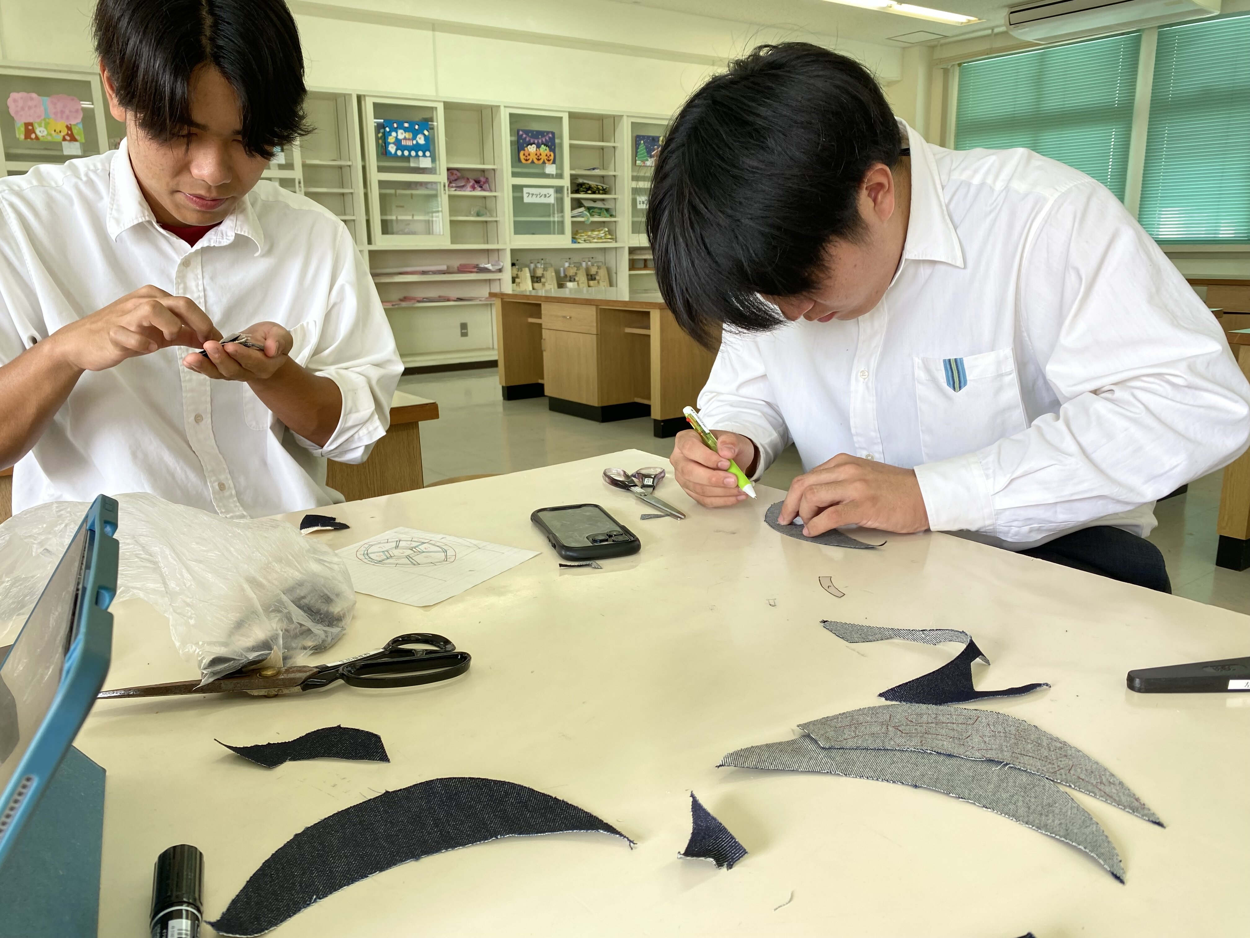 SHIMA DENIM WORKS」様のご協力のもと、まずはアパレル業界やサトウキビ産業の現状についてご教授いただきました。その中で、宮古島で広く栽培されているサトウキビの搾りかす「バガス」が、世界で年間約5億トンも発生しているという課題を知りました。このような背景を踏まえ、同社からご提供いただいた「バガス配合生地」やデニムの端材を用いて、新たな価値を生み出すアップサイクル商品の開発に挑戦しました。